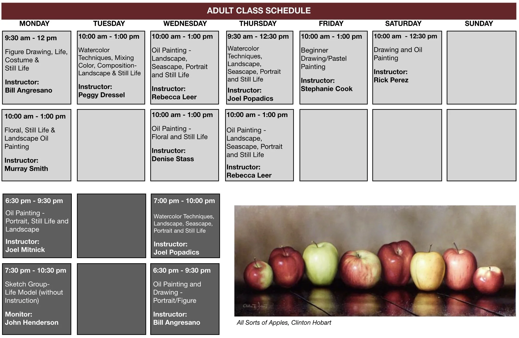 A large selection of Classes offered in Drawing, Oil Painting, Watercolor and Pastel. Check out our schedule of classes to find one that fits your needs. All students must take out a membership in order to take classes after one trial class.